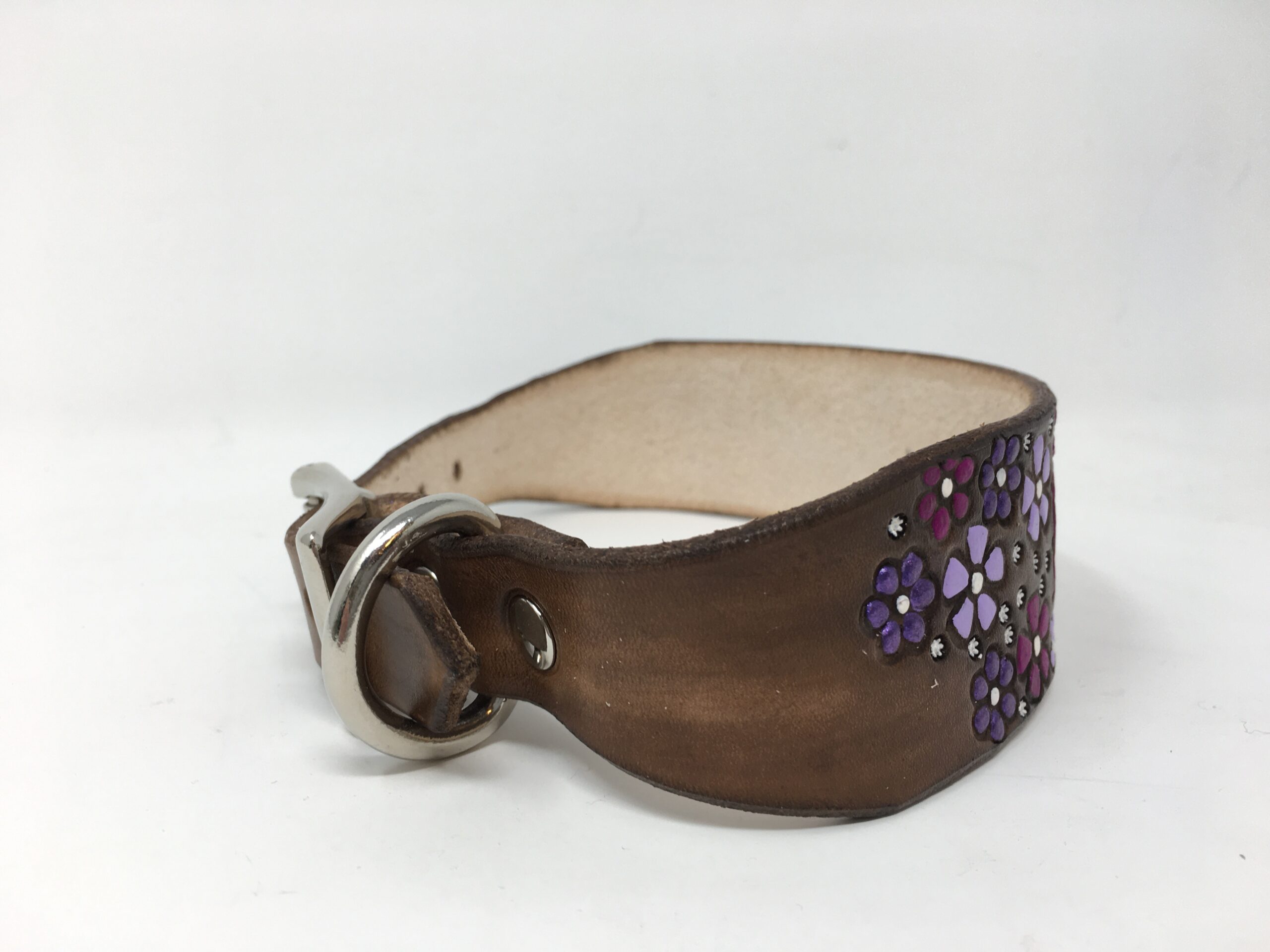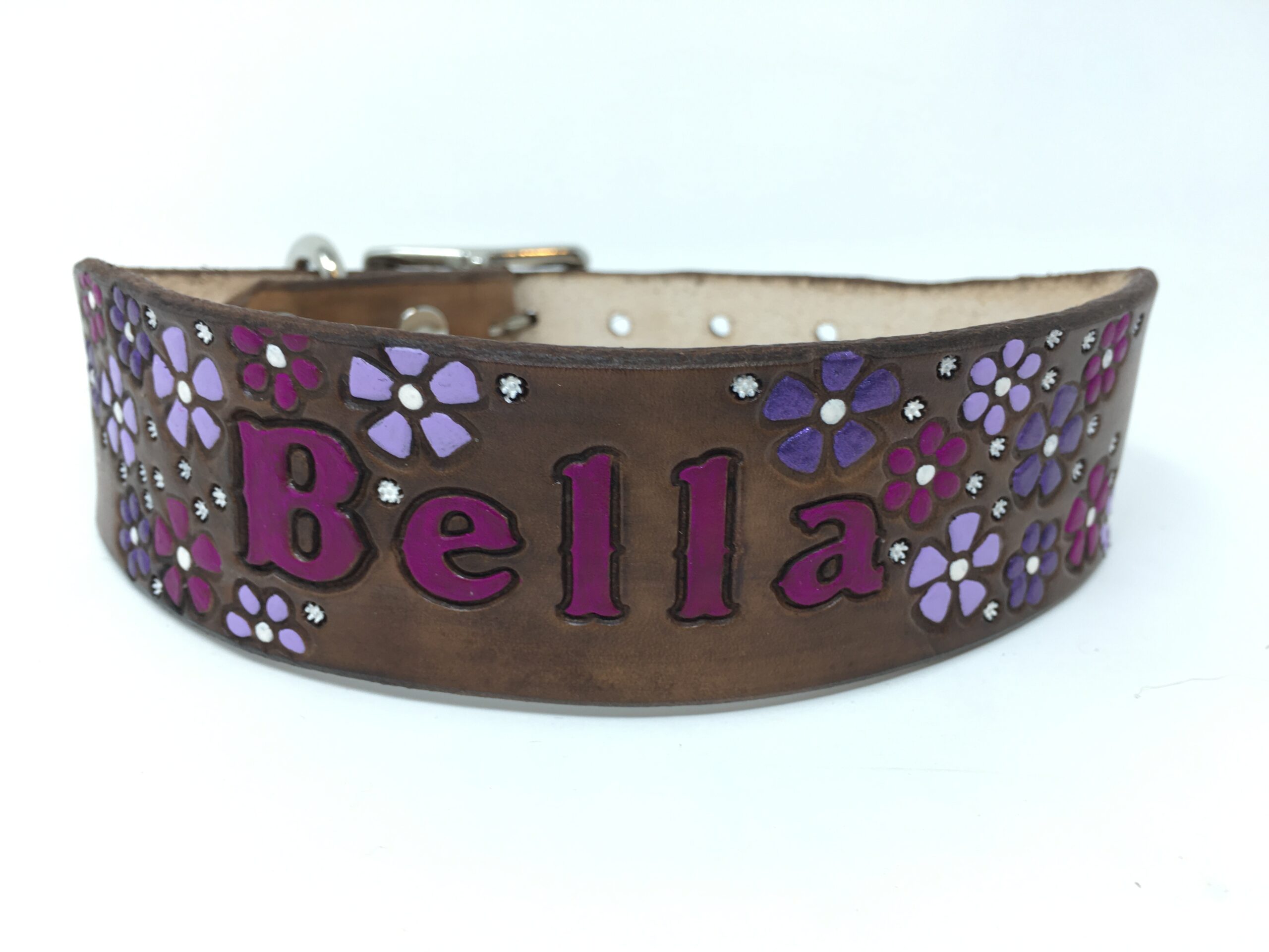 Bison brown leather collar with Purple shades of flowers. Flowers are clumped around your dogs name. There are tiny flowers in white along with white centers. Collar in photo is 1 1/2″ wide and tapers to a 3/4″ buckle.