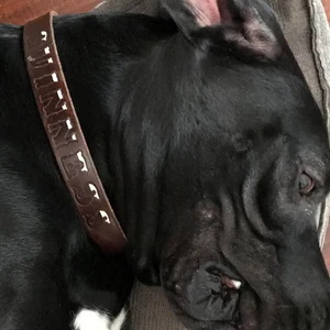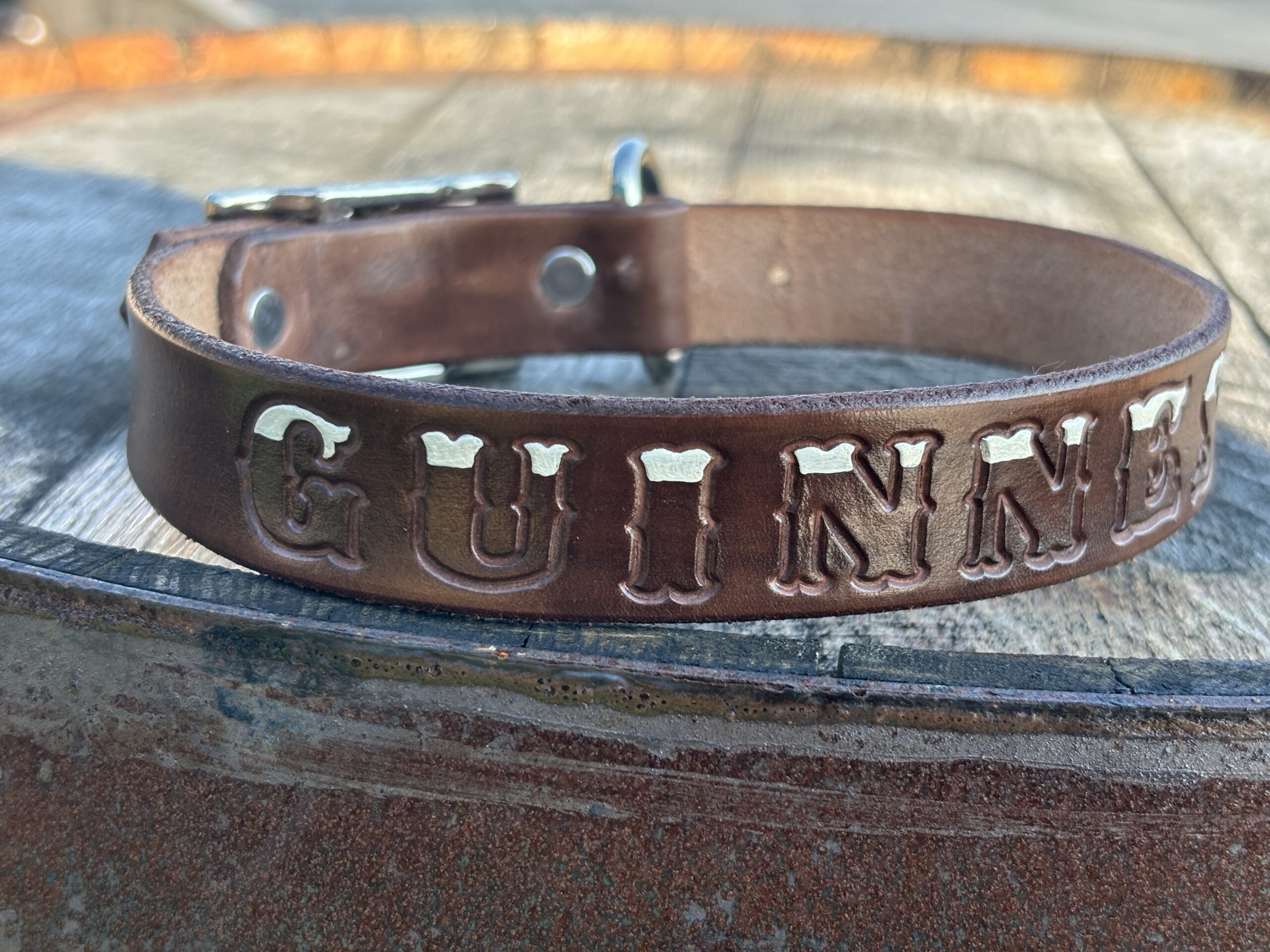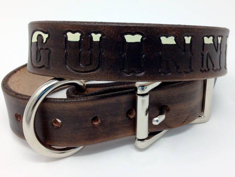 Bison Brown leather collar with tips of letter painted cream color to look like the top of a pint. Super fun collar for your pub pups.