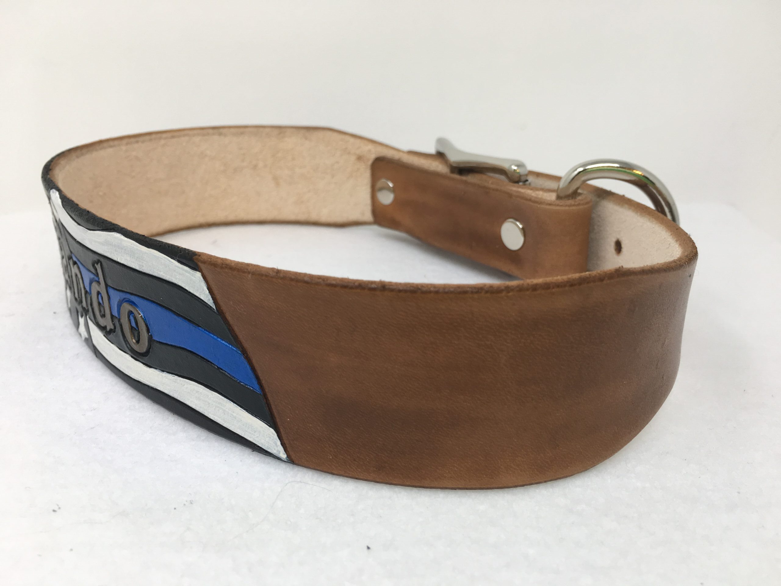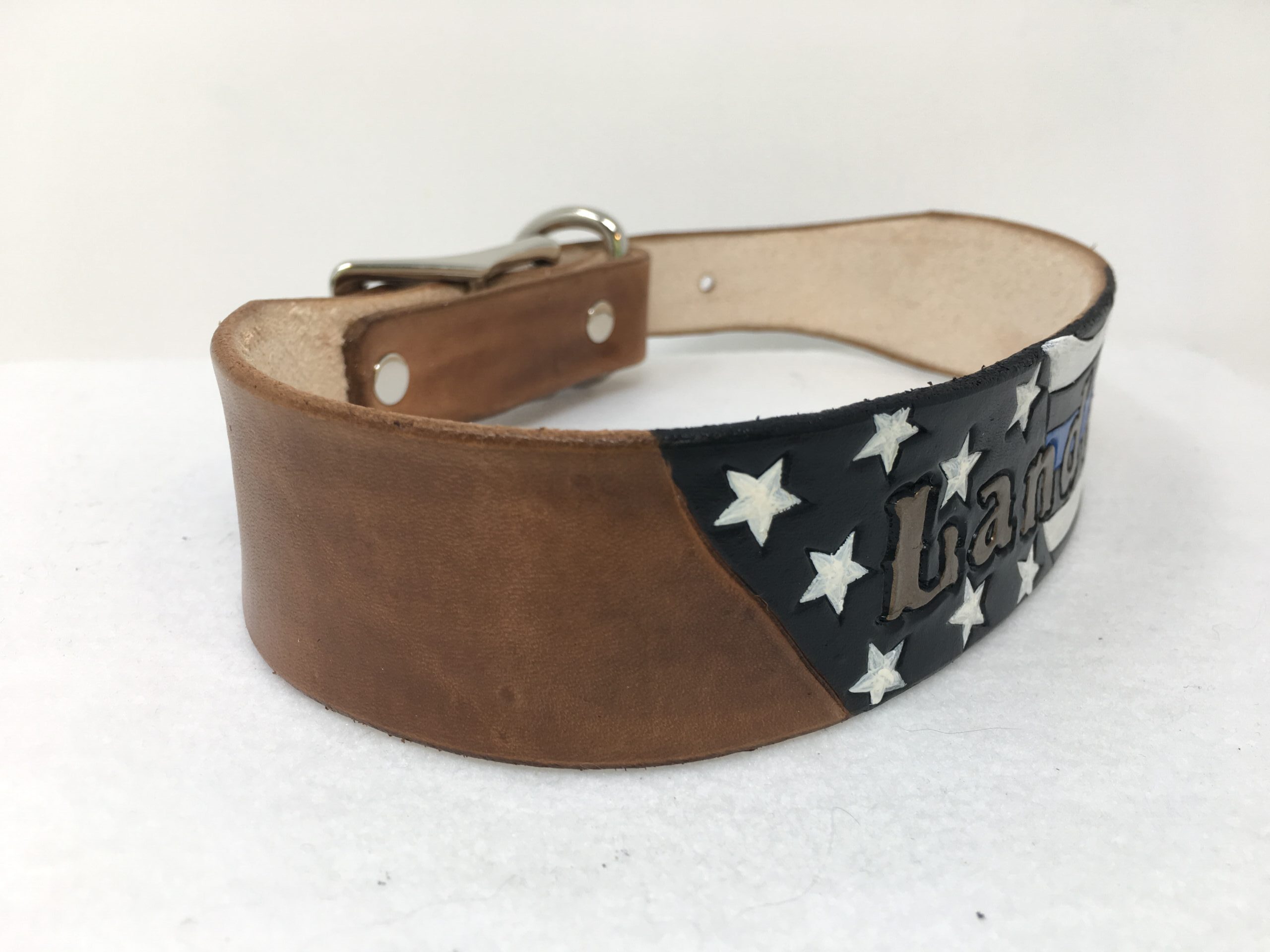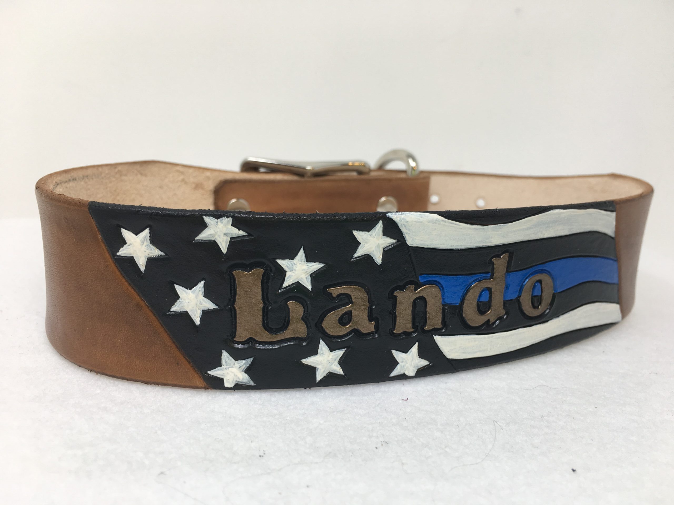 Police flag leather dog collar. Personalized with your dogs name on the flag.