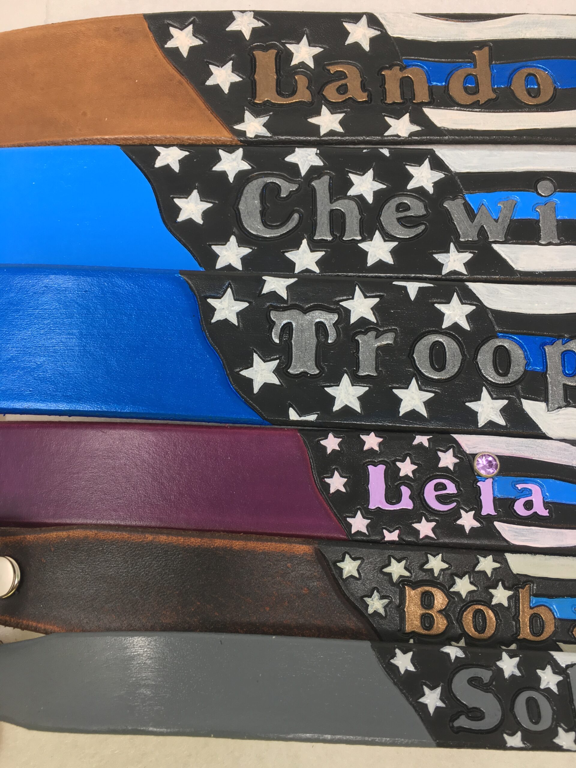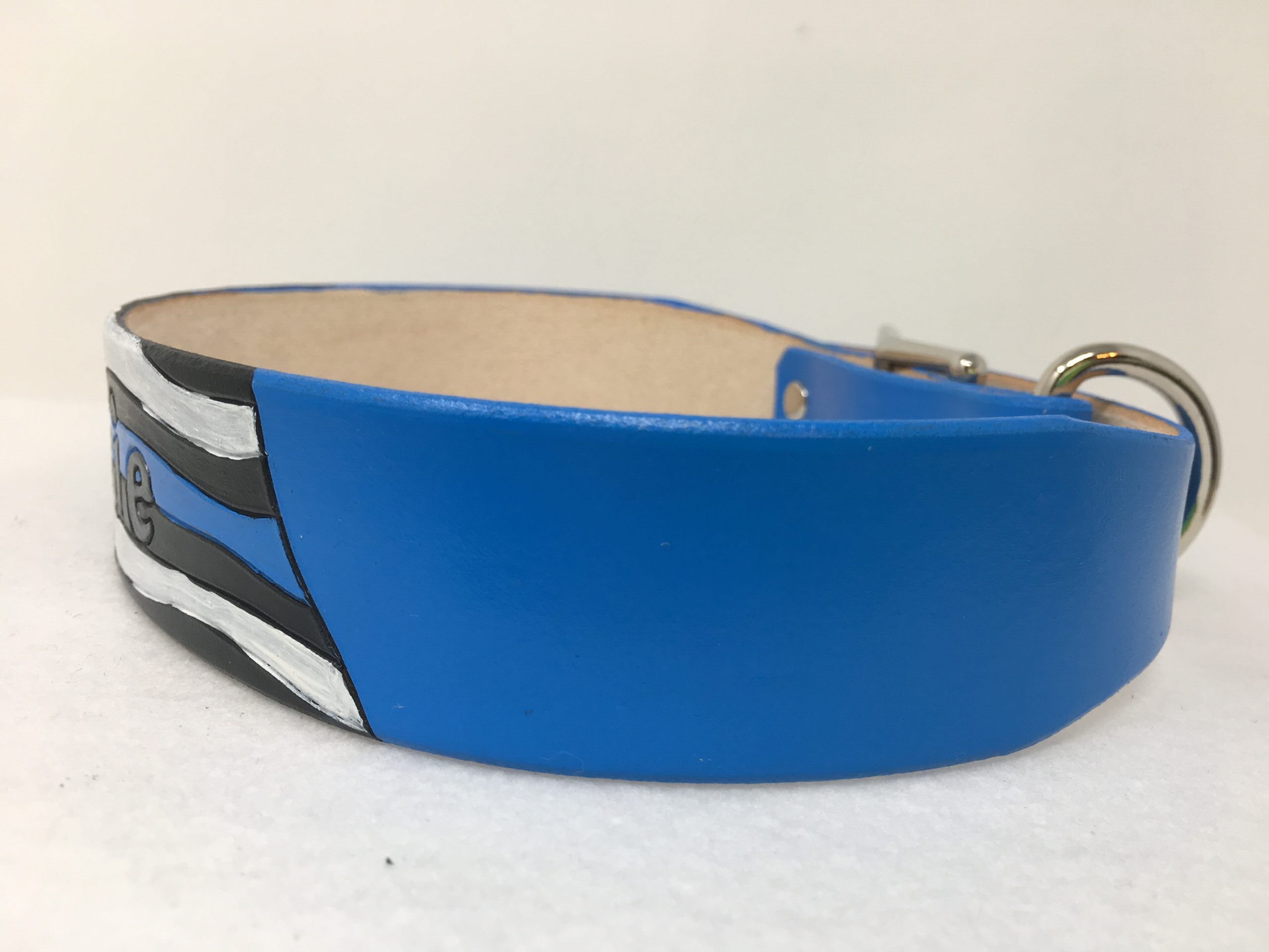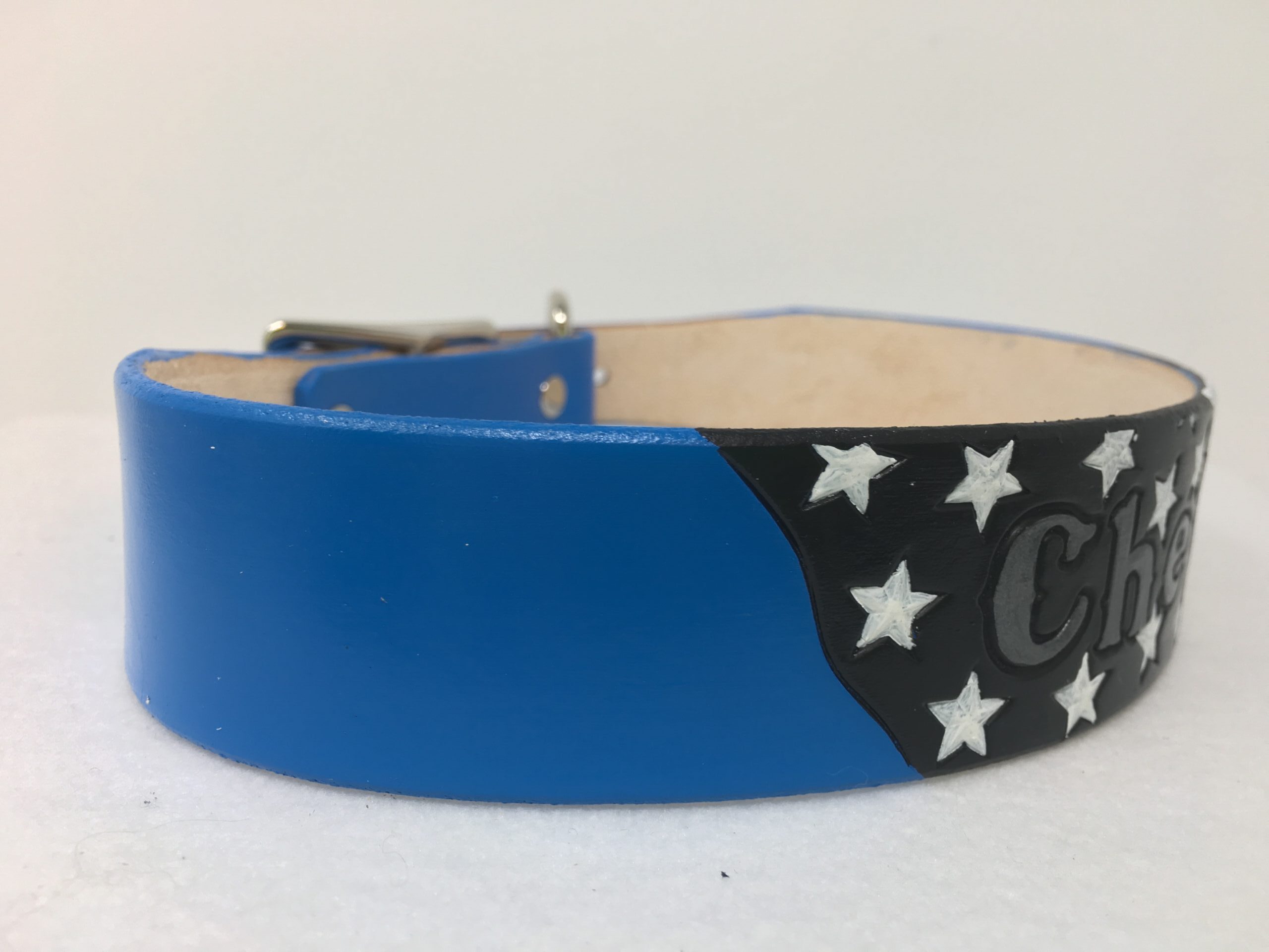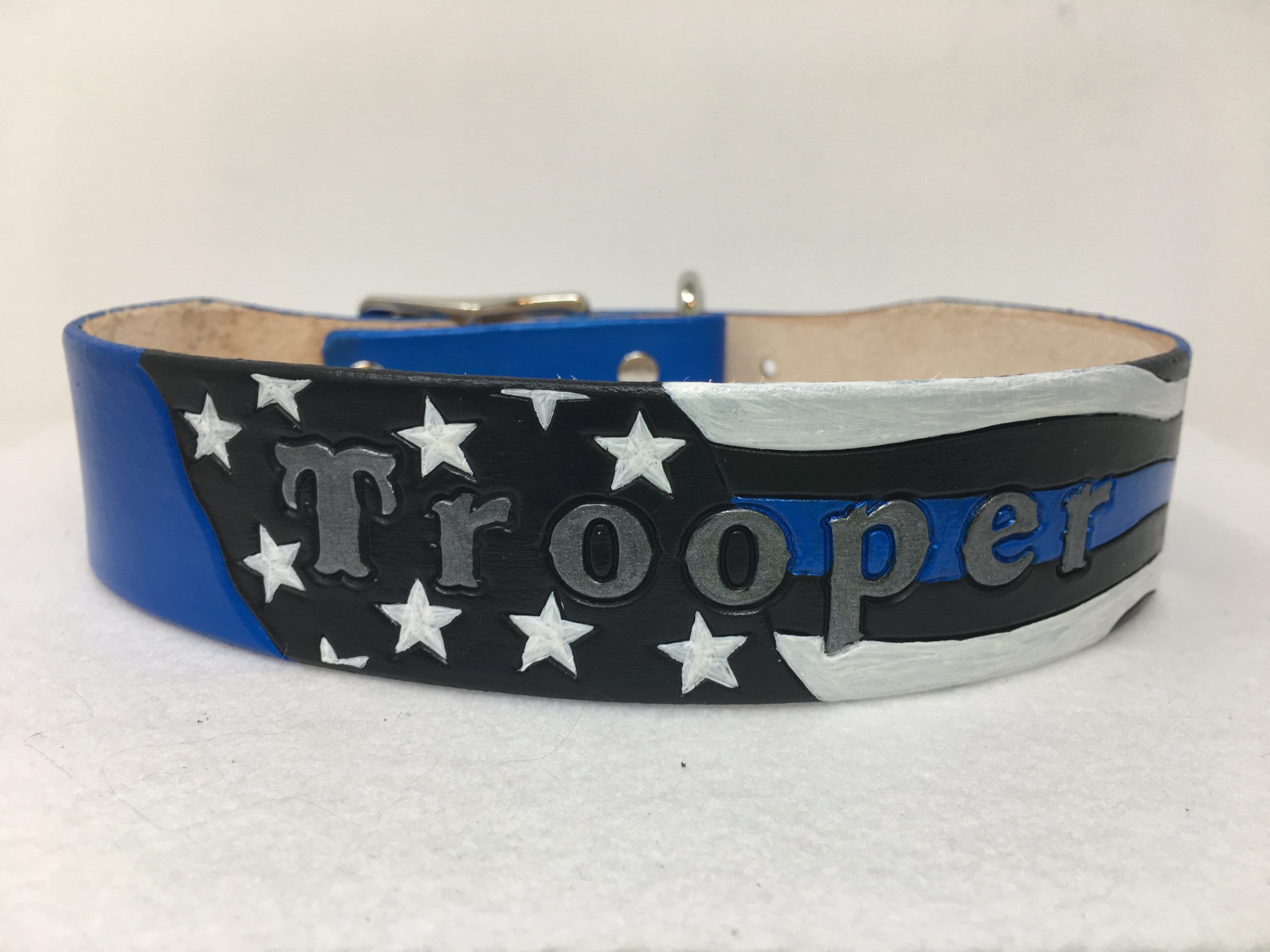 Police flag leather dog collar. Personalized with your dogs name on the flag.