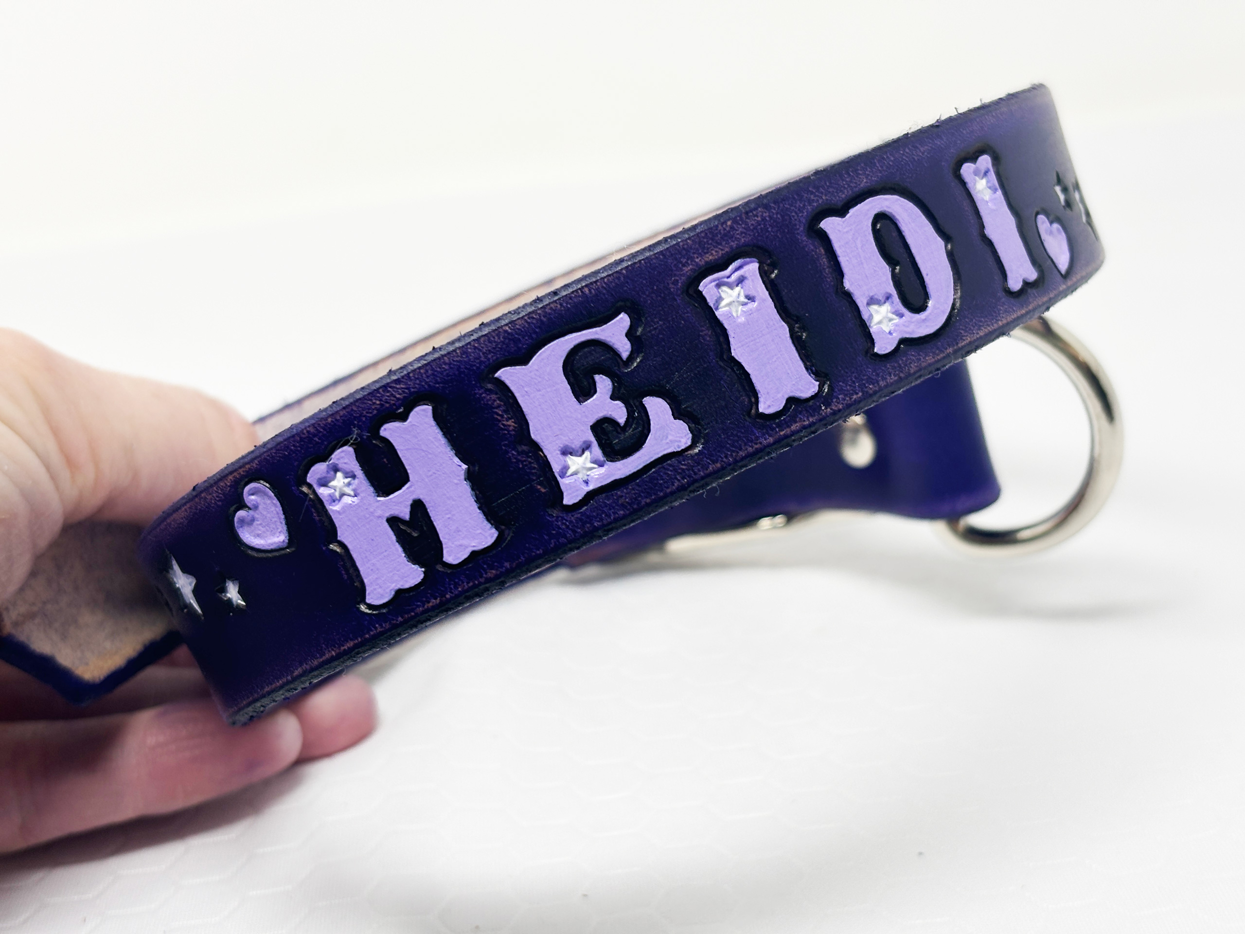 Distressed purple collar with Lilac name with stars in the letters. There are hearts and stars on the rest of the collar.