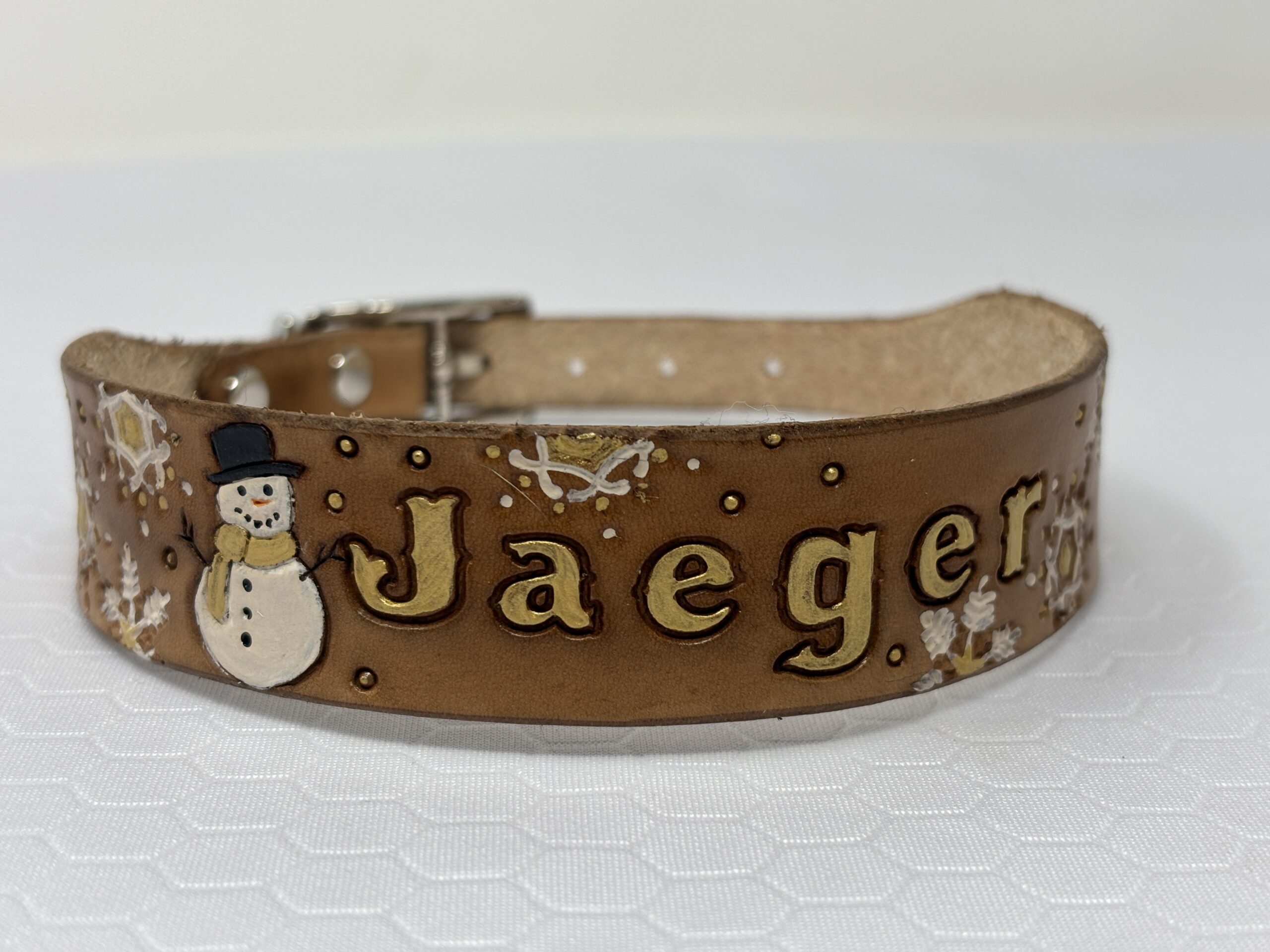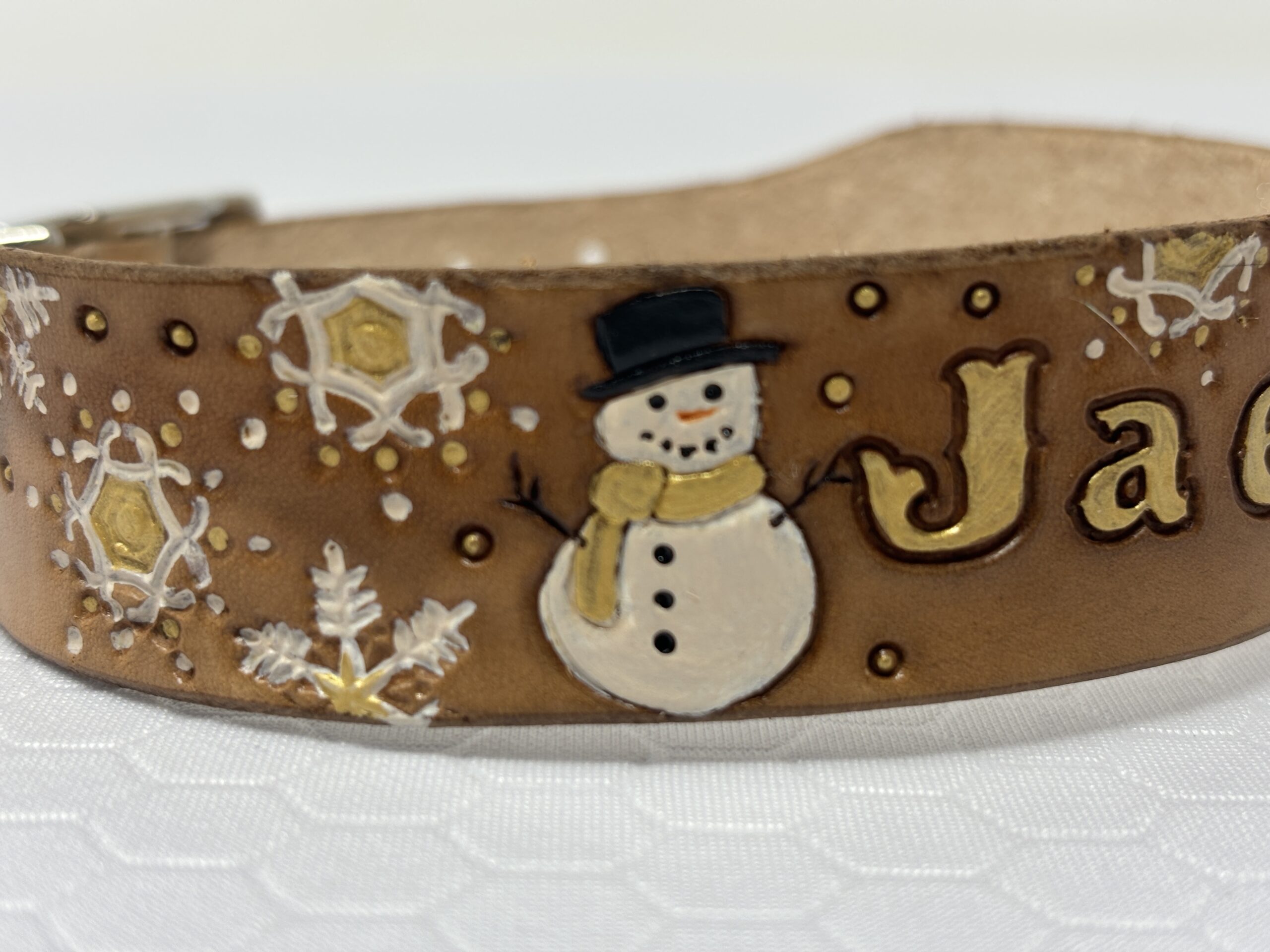 Timber Brown leather collar with white and gold snowflakes. Fun snowman at beginning of name. Perfect winter collar.