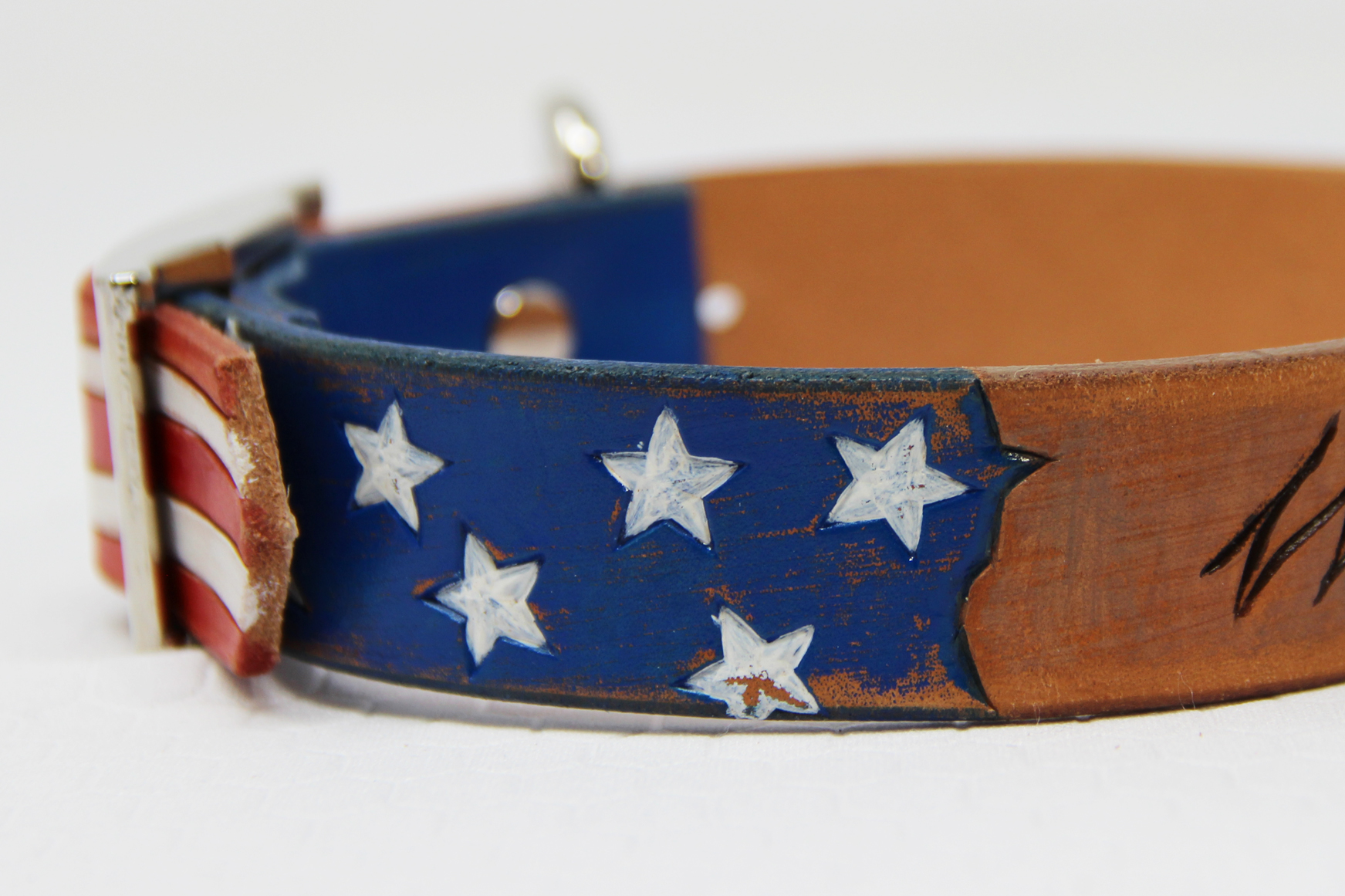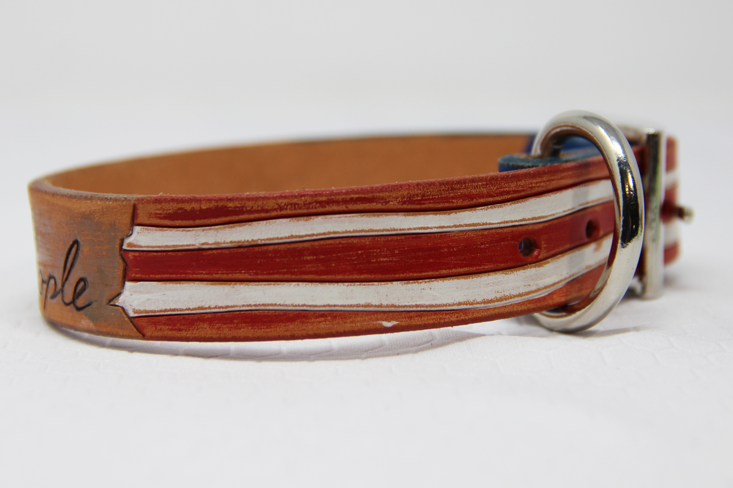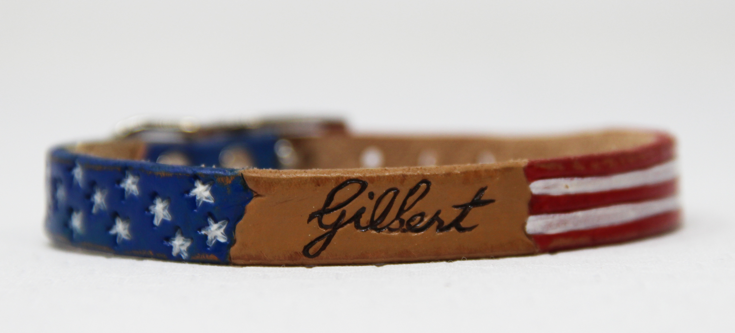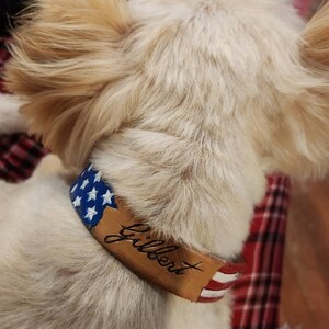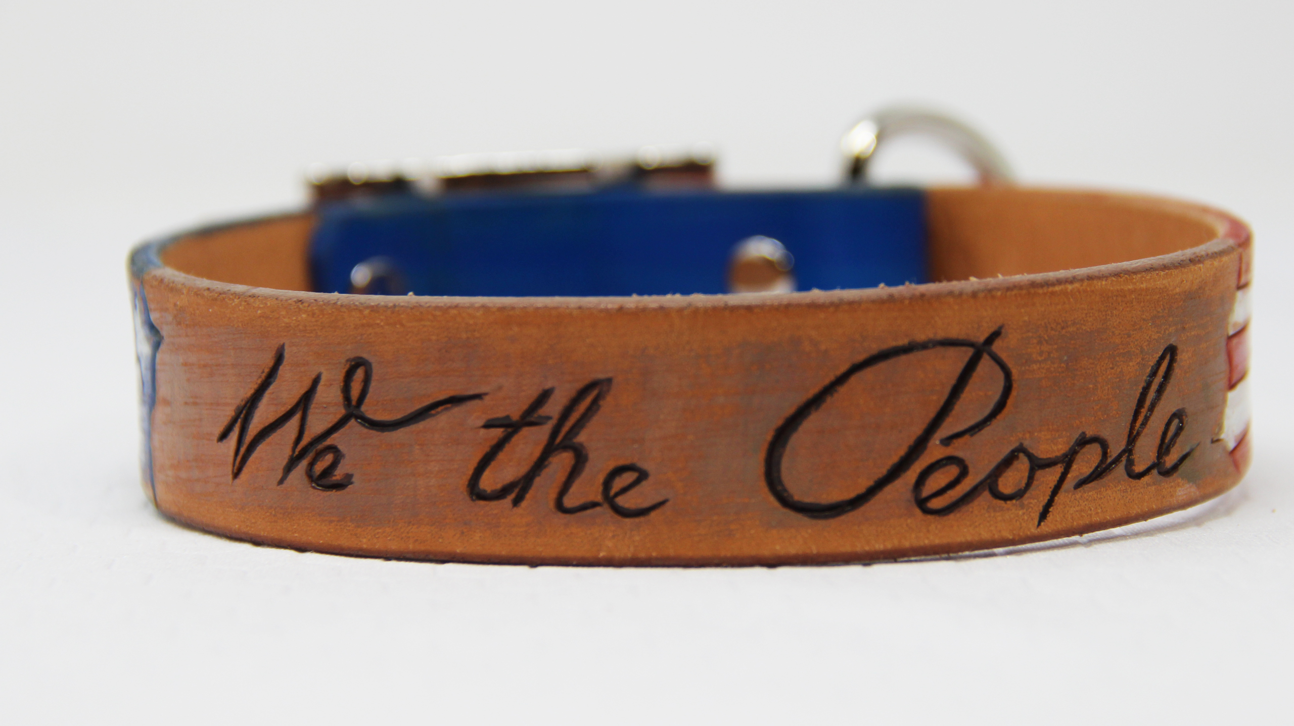 Patriotic Leather collar, this one has parchment look that says “we the people”.  You can choose a name instead of the wording.